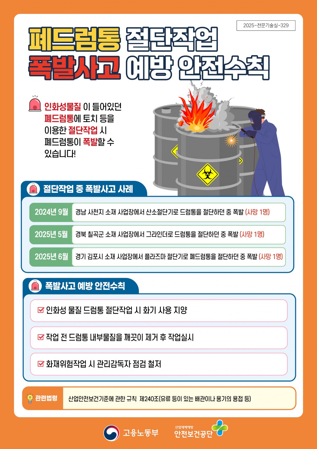 폐드럼통 절단작업 폭발사고 예방 안전수칙 페이지 정보 작성자 관리자 댓글 0건 조회 1,021회 작성일 25-08-13 09:53 본문 목록 이전글장년노동자의 뇌심혈관질환 예방 25.08.13 다음글안전보건공단 위험성평가 컨설팅 무료 지원 안내 25.08.13 댓글목록 댓글목록 등록된 댓글이 없습니다.